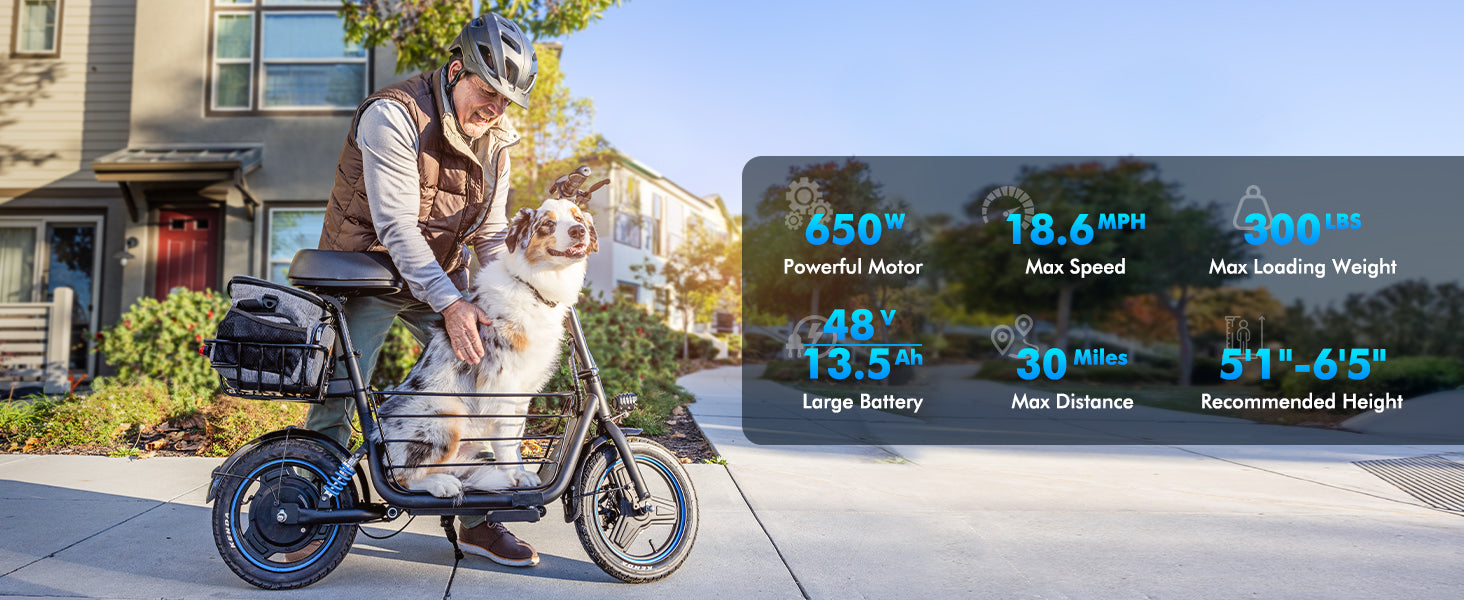 Powered by a robust 650W motor and a 48V/13.5AH high-capacity battery, the scooter achieves speeds up to 18.6mph with a 30-mile range per charge. Supports a max load of 300 lbs, perfect for commuters or leisure rides.