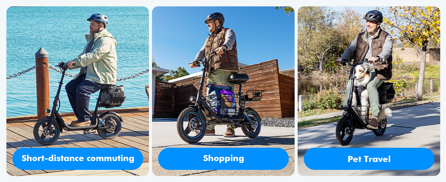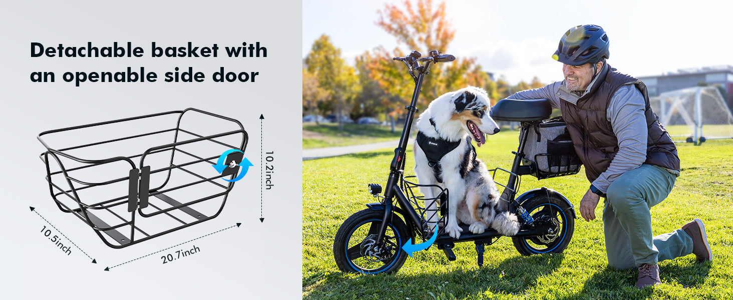 This seated electric scooter features a detachable oversized front basket and a compact rear basket, ideal for groceries, essentials, or pet adventures. The extra-wide 11.8-inch deck offers ample footroom and space for small pets, catering to diverse daily needs.