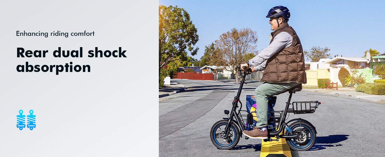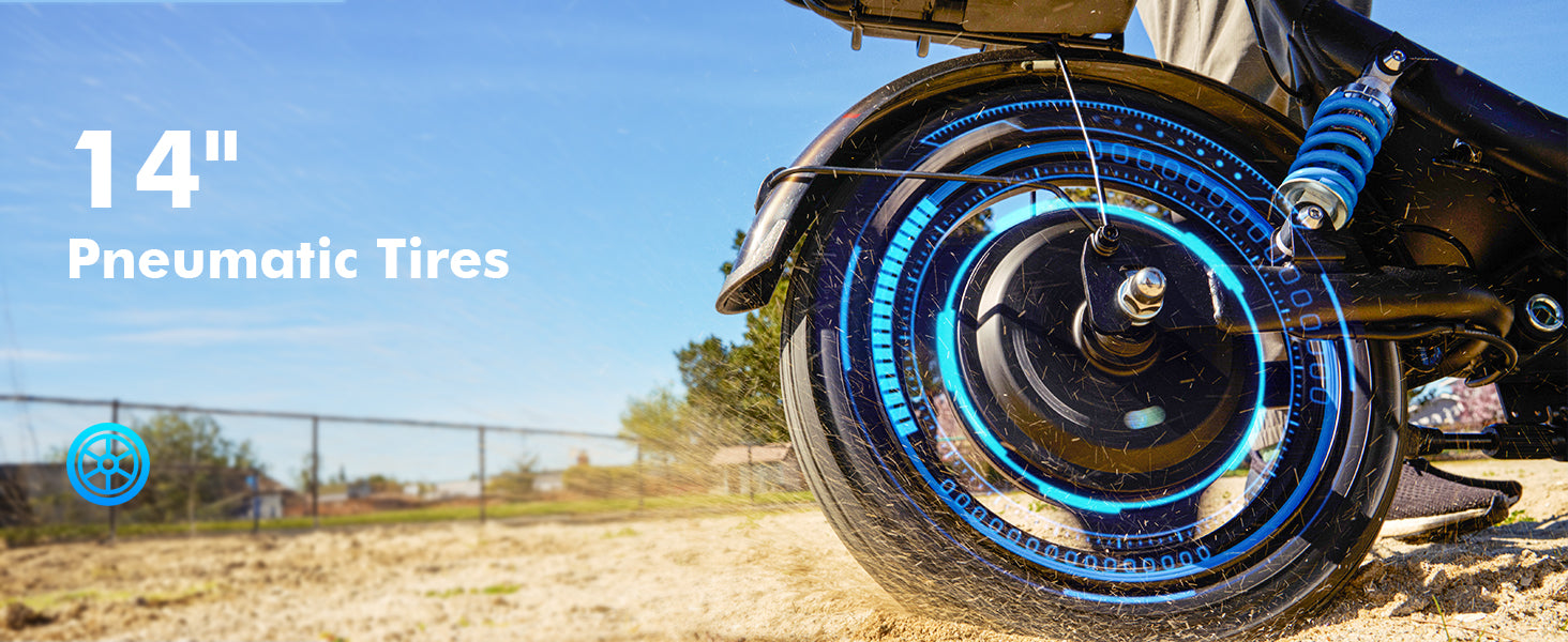 Enhanced by 14-inch pneumatic tires and dual disc brakes (front + rear), it delivers superior traction and responsive stopping power for a smooth, secure ride on varied terrain.