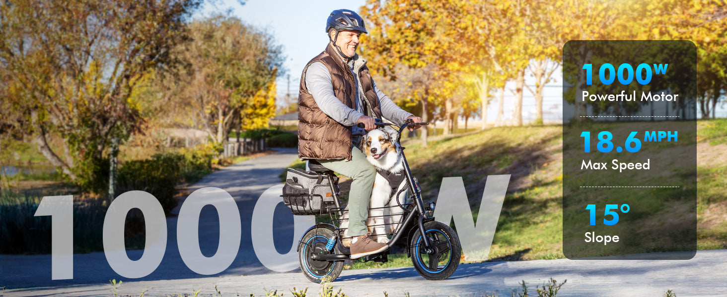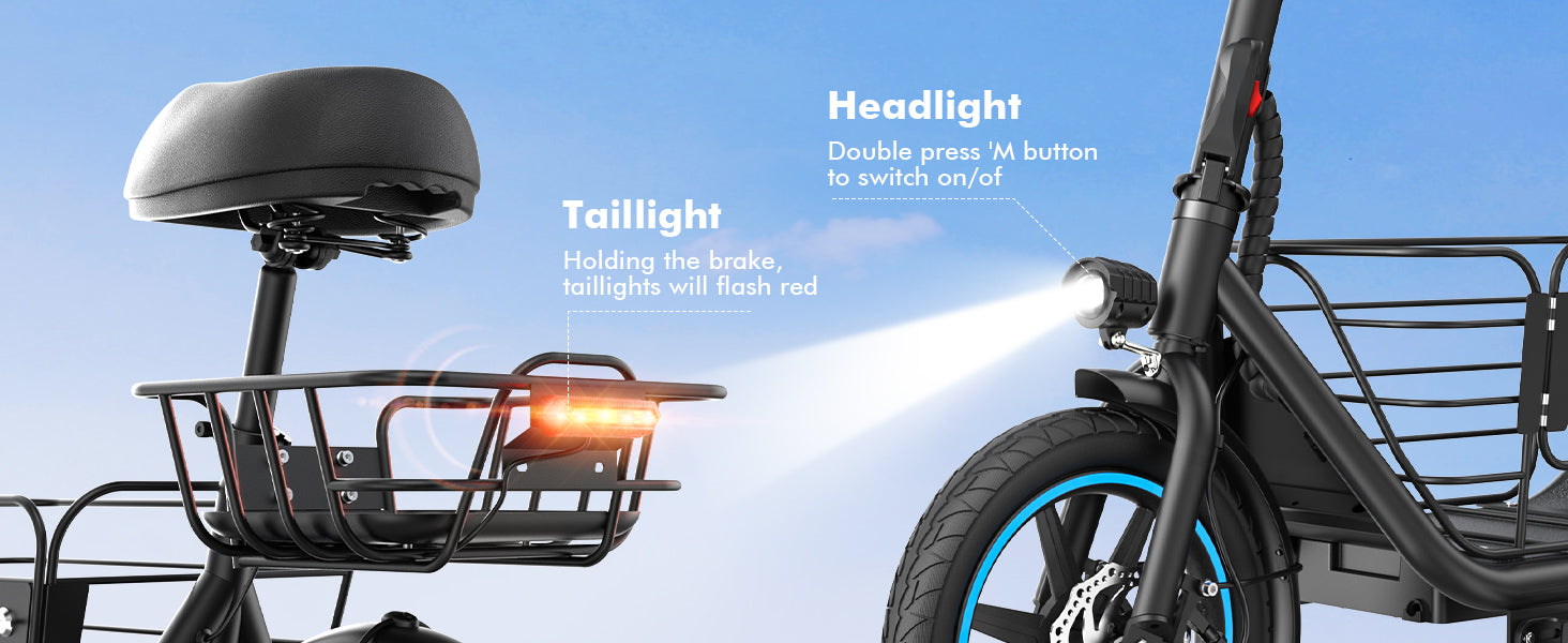 Crafted with a full-metal foldable frame for durability and easy storage/transport. The integrated LED headlight ensures nighttime visibility, while the 300-lb weight capacity suits most riders.